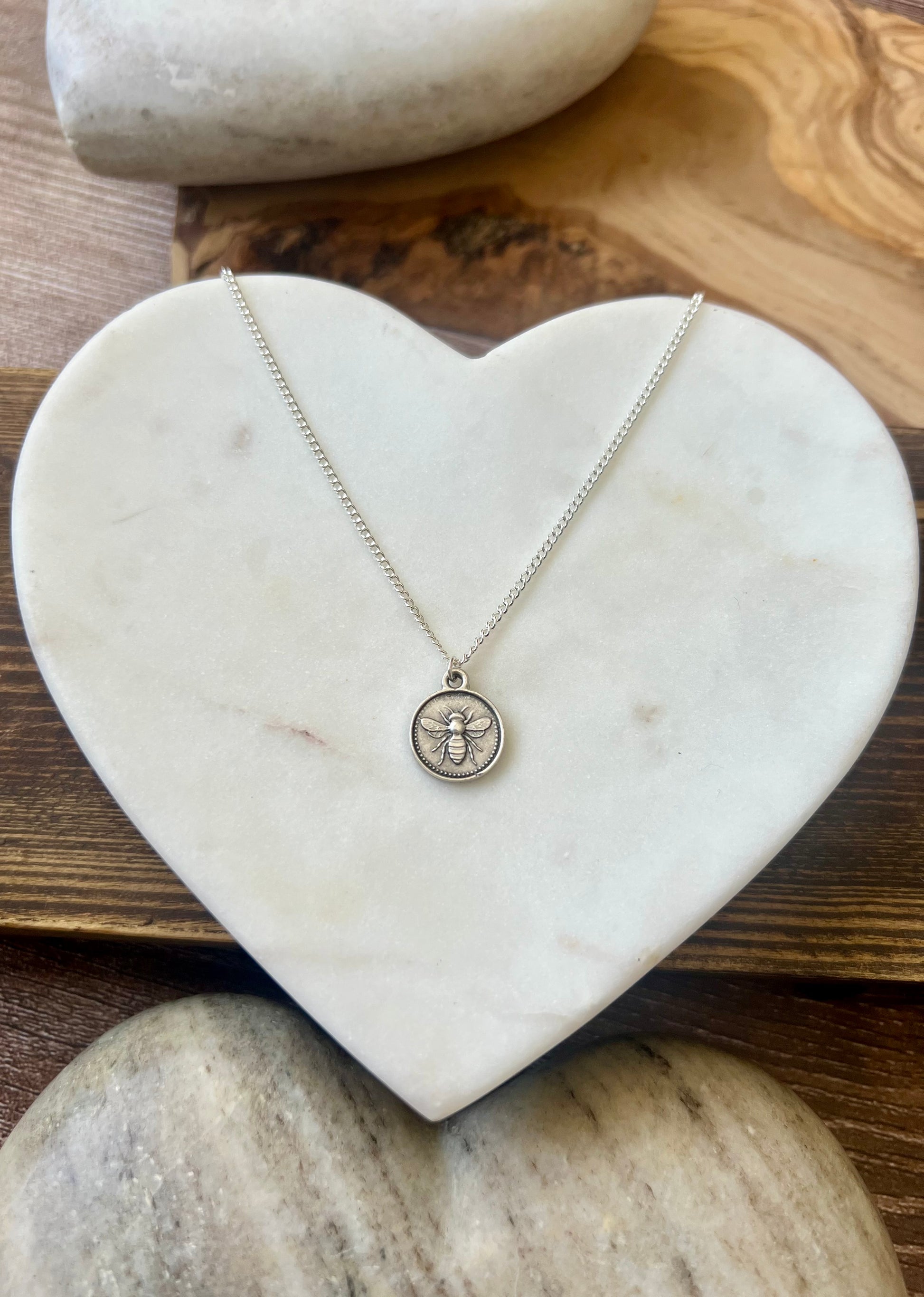 This necklace features an antique silver plated "Coin" pendant with a 17x13mm Bumblebee design. It comes on a 18 inch .925 sterling silver plated chain.