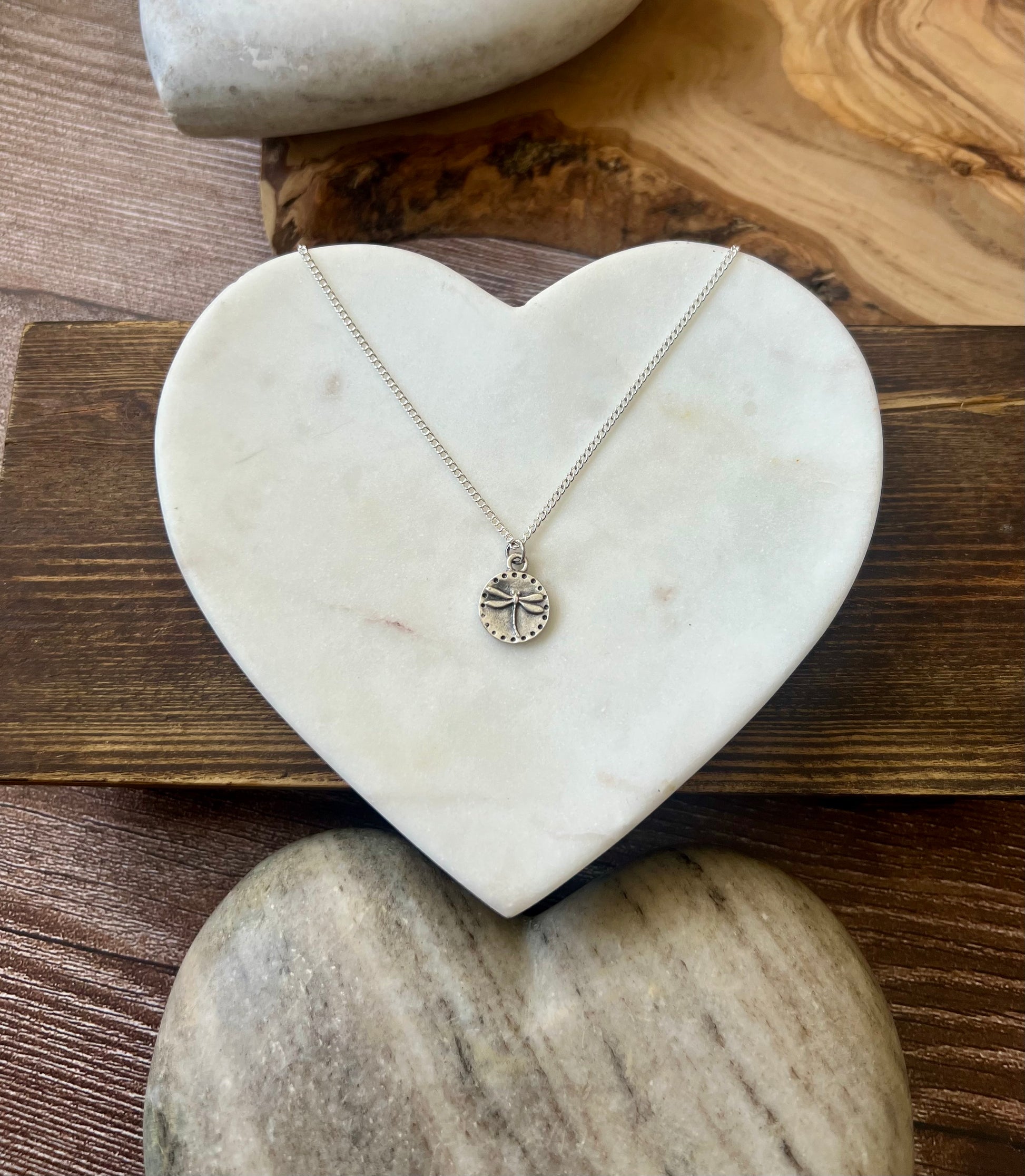 This necklace features an antique silver plated "Coin" pendant with a 17x13mm Dragonfly design. It comes on a 18 inch .925 sterling silver plated chain.