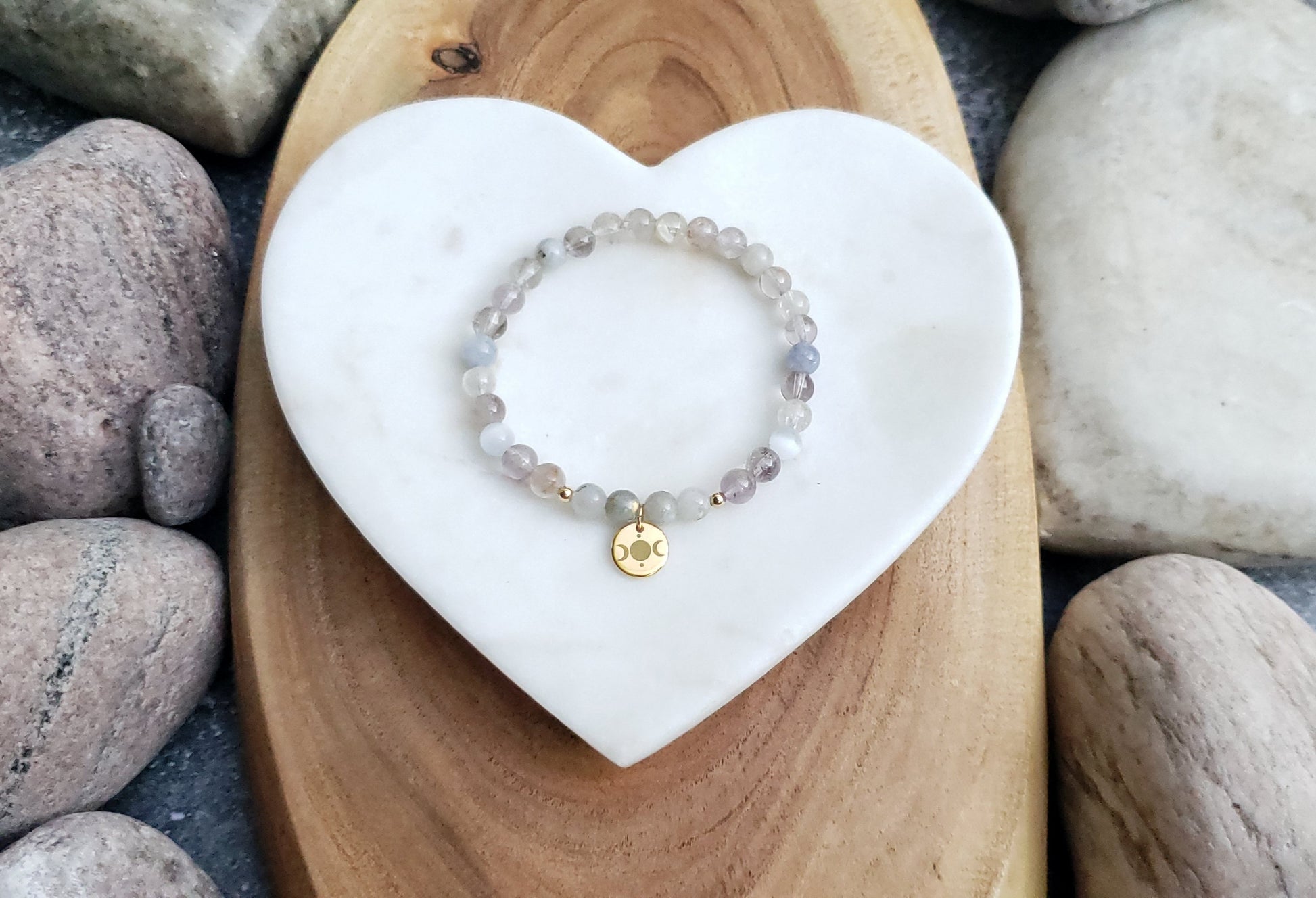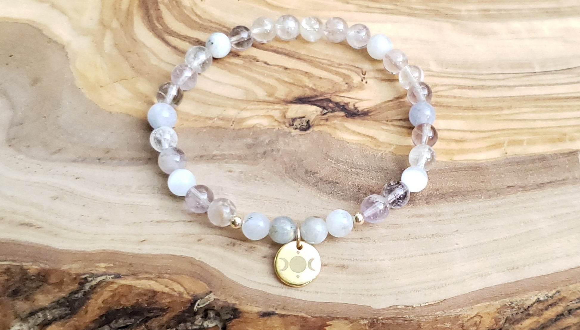 This 6mm beaded stretch bracelet features diluted amethyst, aquamarine, selenite and moonstone beads, as well as 3mm 14k gold accent beads. It has a gold plated, etched moon phases charm.