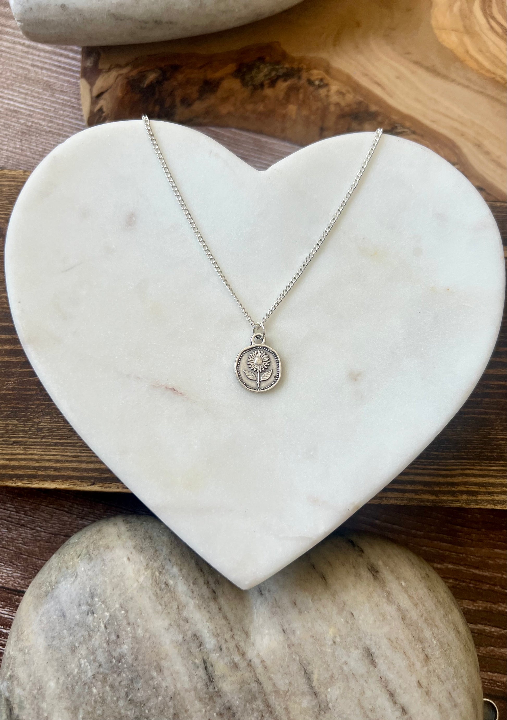 This necklace features an antique silver plated "Coin" pendant with a 17x13mm Sunflower design. It comes on a 18 inch .925 sterling silver plated chain.